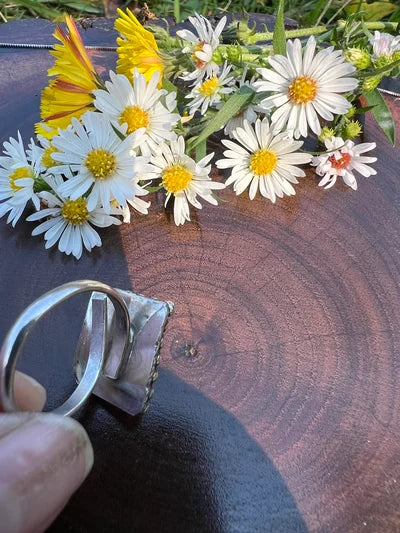 Green turquoise ring designed to fit sizes 6-7.5 with a band that has some give to it so it would fit easily over bigger knuckles and still remain snug enough to be comfortable once on.