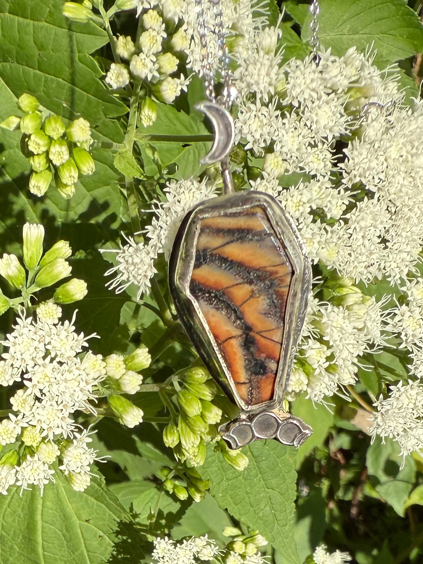 Made of sterling silver, fine silver, and a fossilized Snakeskin Wrasse fossil stone. Comes on a sterling silver chain that is 18” long.