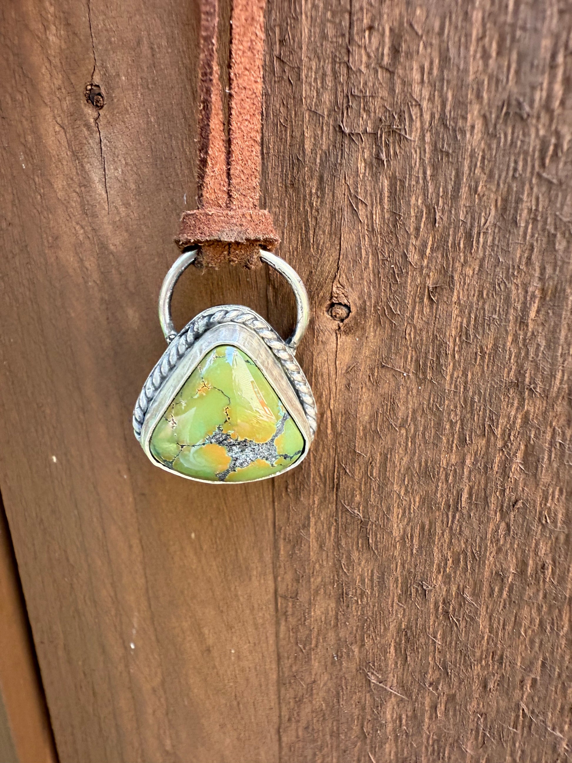 Made from sterling silver and Bamboo Mountain Turquoise. A natural spider web inclusion makes this stone visually interesting.