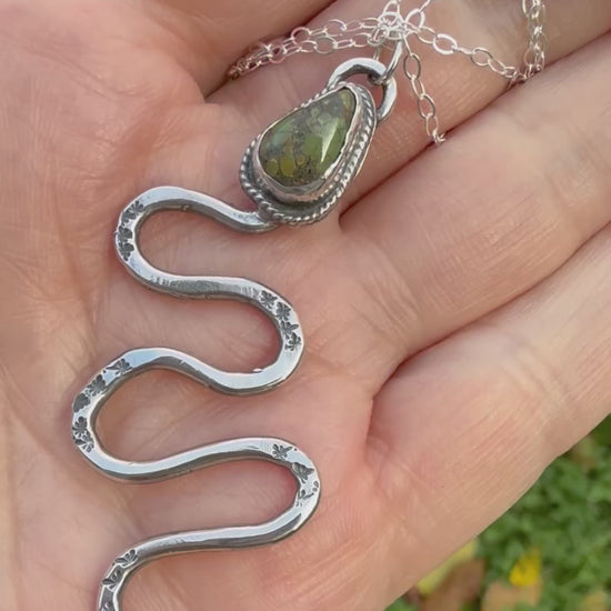 This silver snake has a turquoise head and stamping on its body. Made from sterling silver, fine silver, and Bamboo Mountain turquoise.