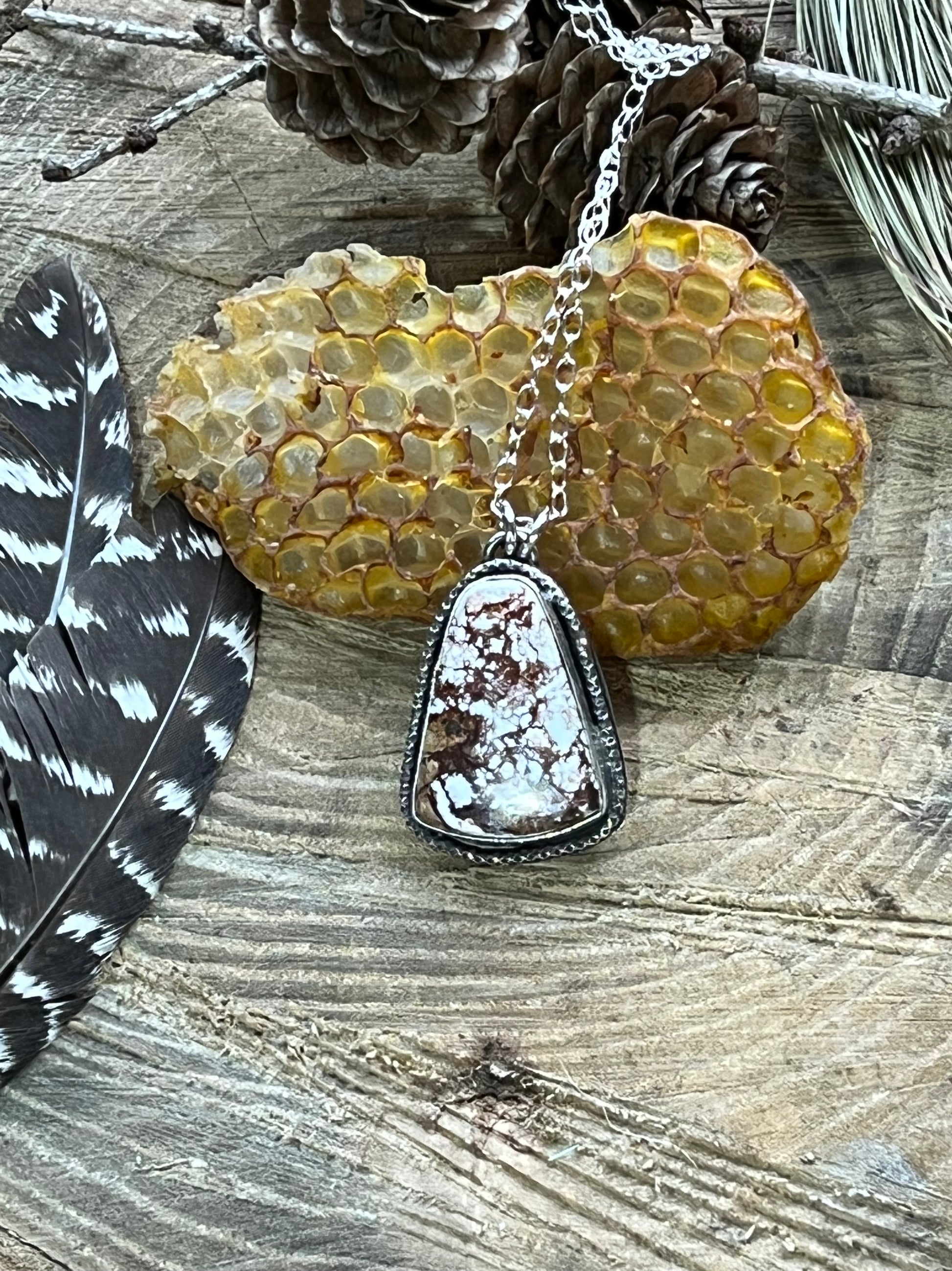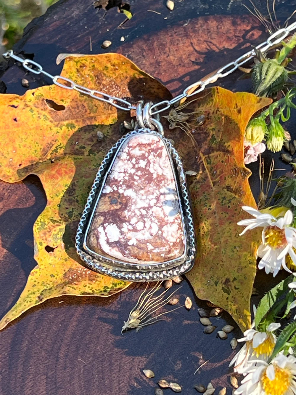 Made of sterling silver, fine silver, and a Wild Horse Jasper stone. Comes with a sterling silver chain that is 20” long but the clasp will go on any link so it can be worn at any desired length.